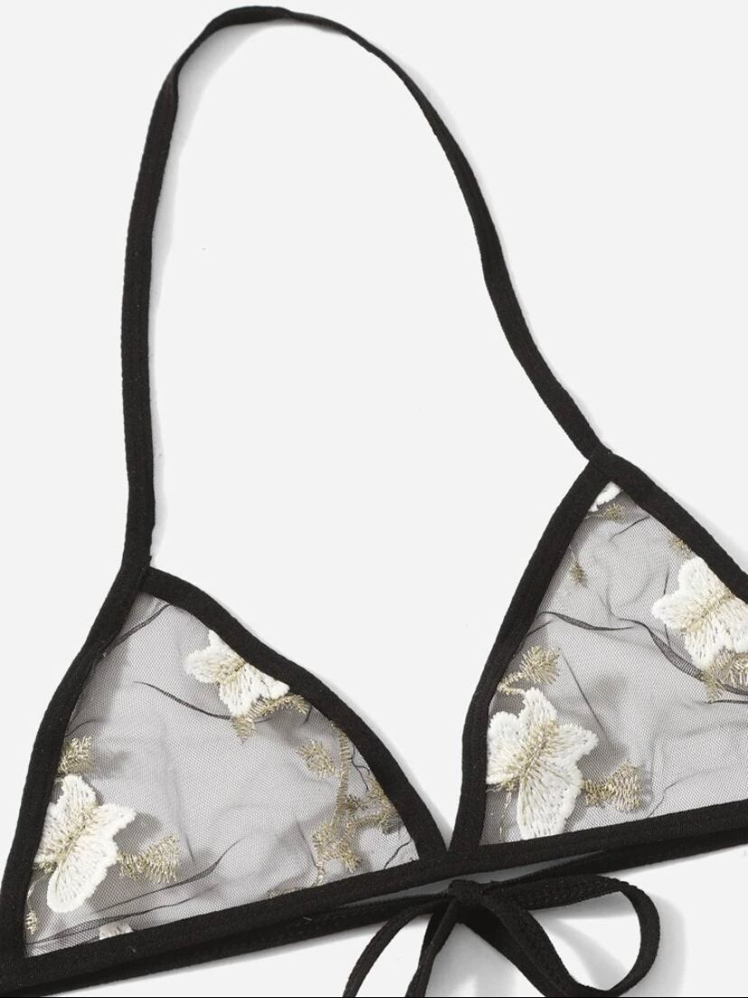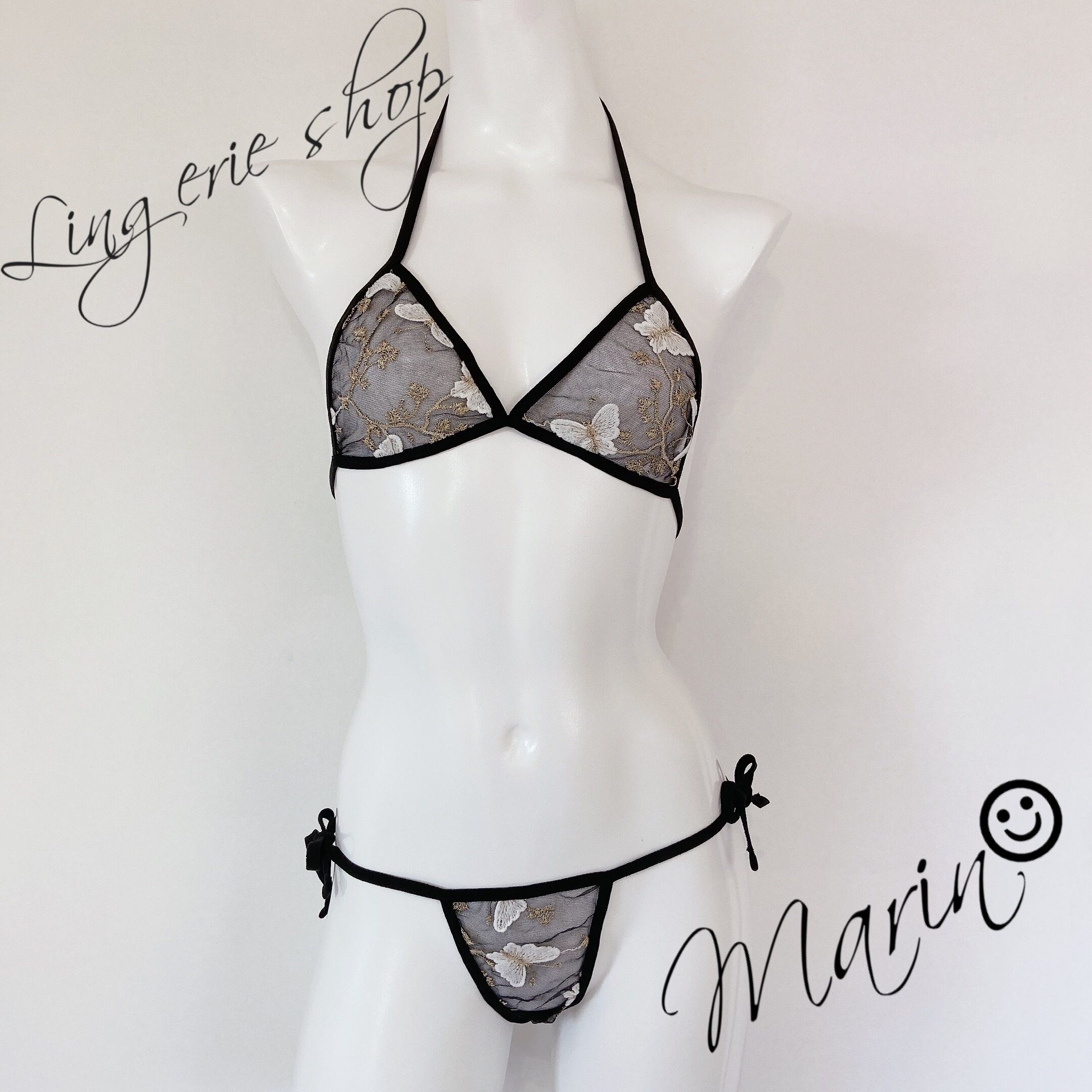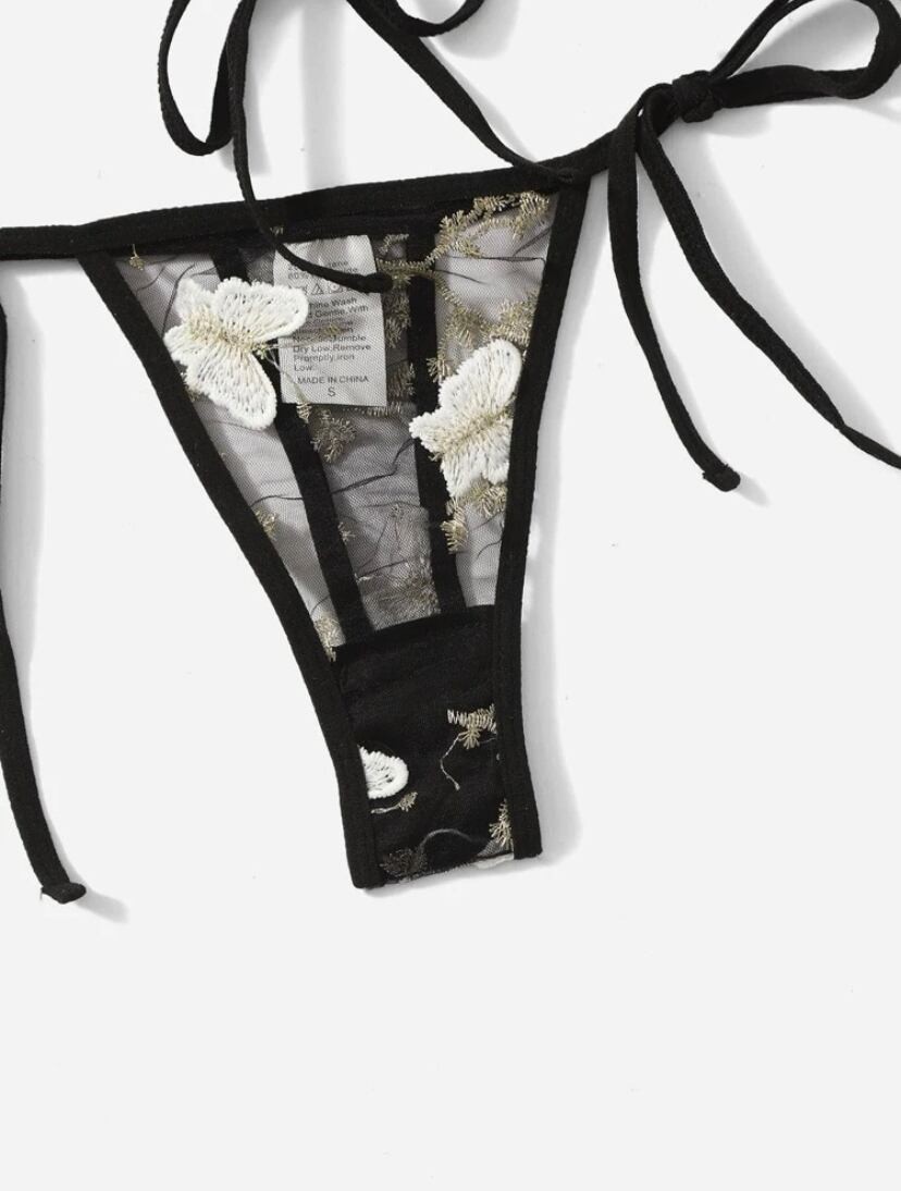 ブラック生地にホワイトの蝶々が刺繍された可愛いデザインのセクシーランジェリー。