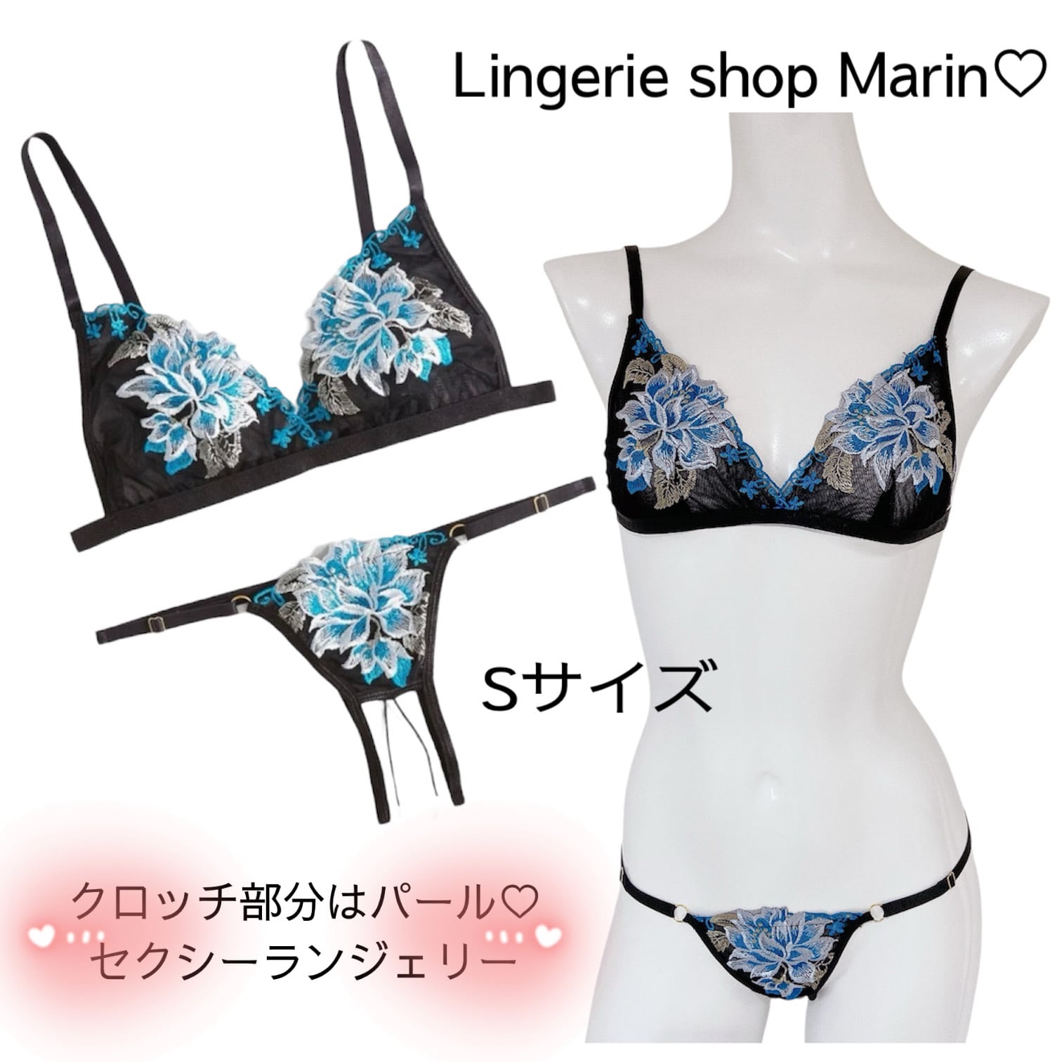 黒地に鮮やかな水色のお花が刺繍された綺麗なランジェリーセット。