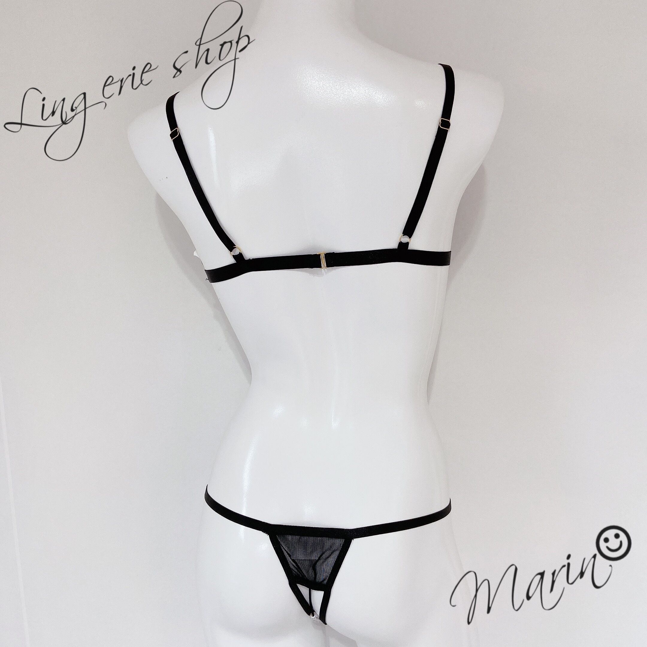 ショーツはオープンクロッチの股割れタイプで、フェイクパール付き。