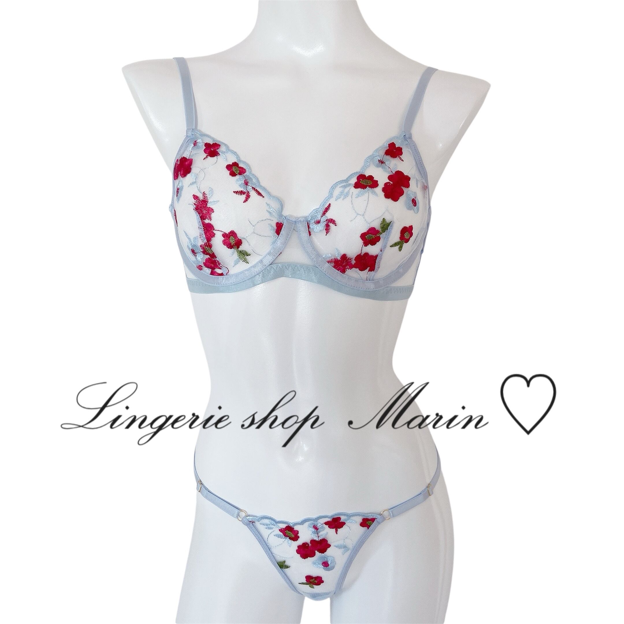 ライトブルーベースに真っ赤な花の刺繍がきれいなブラジャーとショーツのセットです。