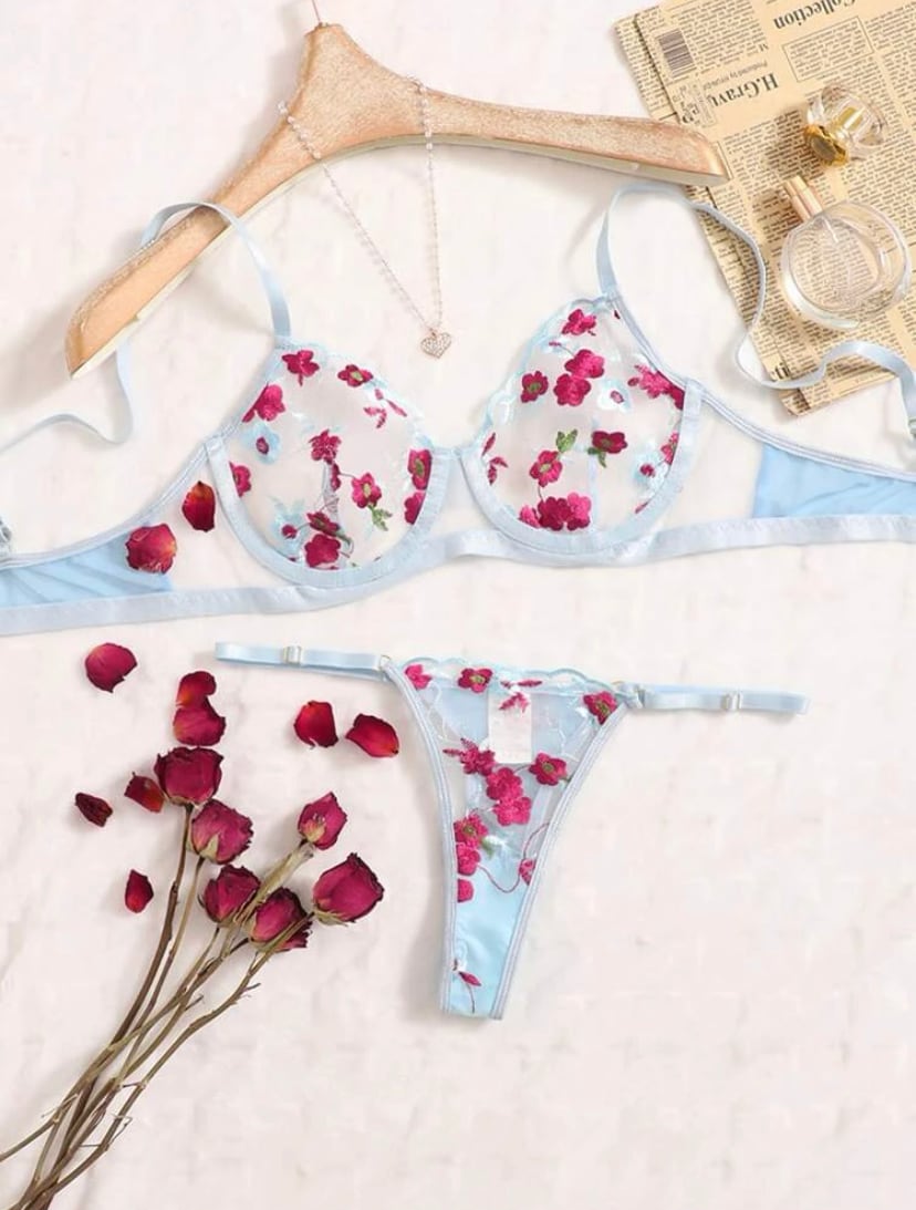 BS-69/真っ赤なお花が刺繍されたセクシーランジェリー上下セット/水色