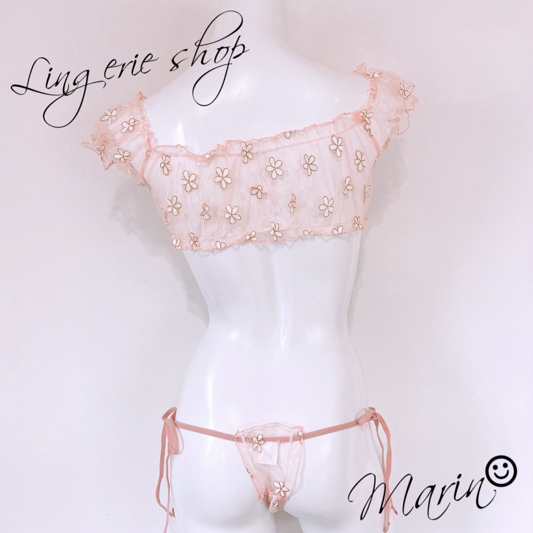 ベビーピンクのシースルー生地に、お花が散りばめられたトップスとセクシーな紐パンツのセット。