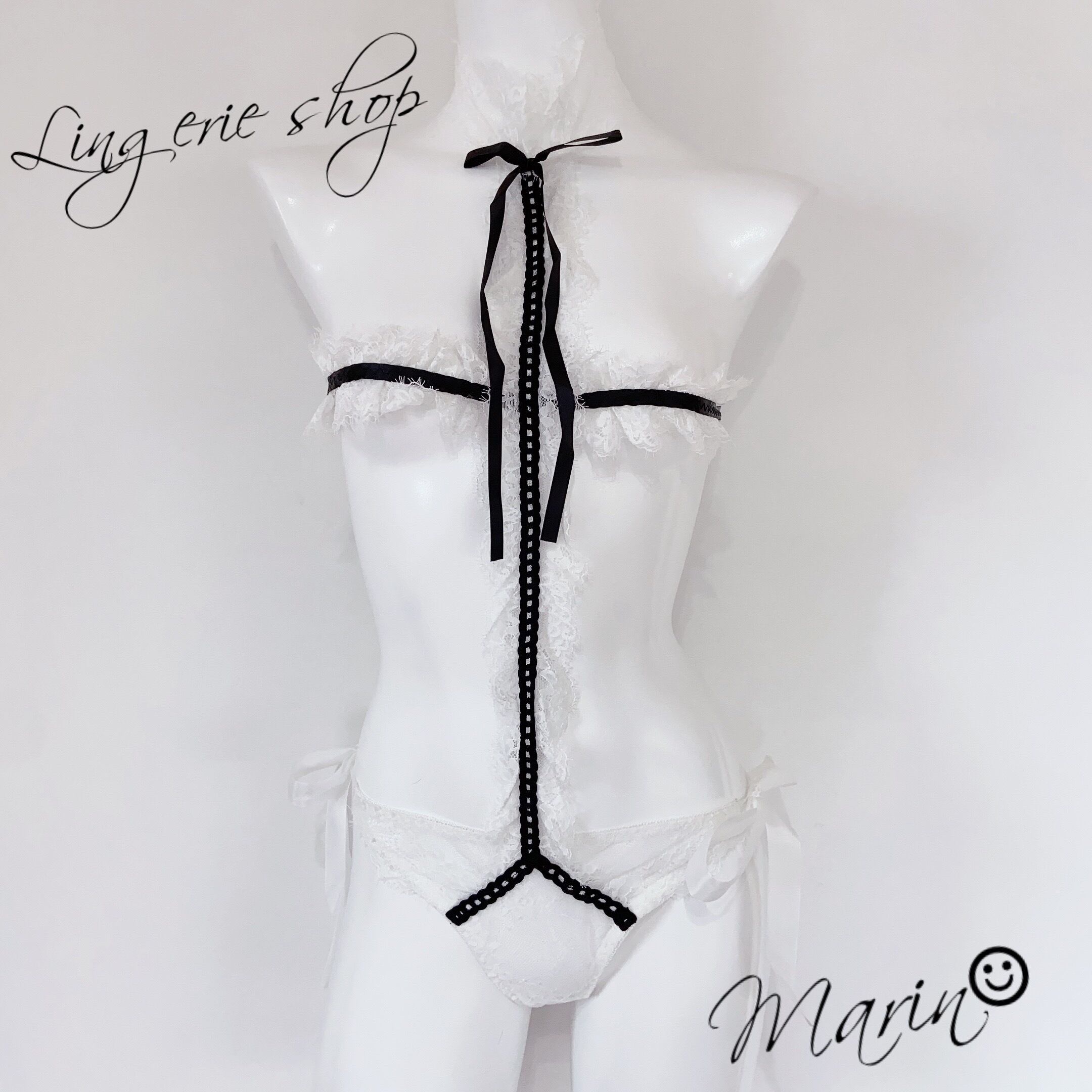 T-38/首からショーツまでの一体型!フリルレースのスーパーセクシーテディ/モノクロ/M